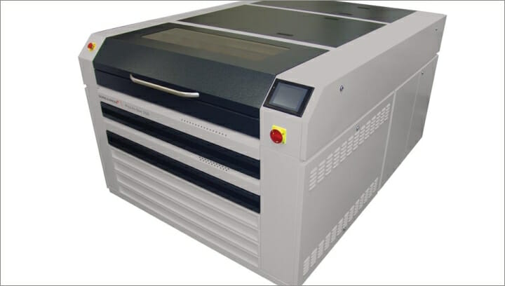 Das Gerät nutzt 16 Lampen mit hohem UV-A Ausstoß. Vier rotierende Bürsten ermöglichen hohe Durchlaufgeschwindigkeiten. Die Trockenstrecke besteht aus vier isolierten Schubladen mit individuell einstellbaren Schaltuhren für schnelles und konsistentes Trocknen. (Bildquelle: Glunz & Jensen)