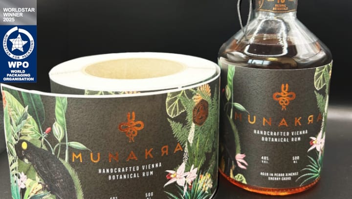 Prämiert wurden das Etikett für »Munakra – Botanical Rum« für die gelungene Verbindung von Design, Handwerkskunst und technischer Raffinesse sowie das papierbasierte Coveretikett »Drillinge« als Vorzeigeprojekt für nachhaltige, kunststofffreie Verpackungslösungen.