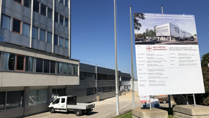 Mit dem Abbruch des alten Verwaltungshochhauses wurde bereits begonnen und wird in den nächsten Wochen sukzessive und fachgerecht durch eine Abbruchfirma abgetragen. Das gesamte Bauprojekt soll dann bis Ende 2024 abgeschlossen sein. (Bildquelle: Schäfer Etiketten / Reynders)