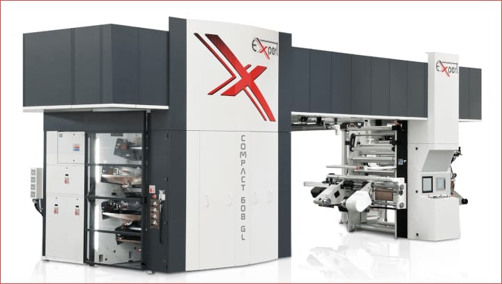 EXPERT Die Zentralzylinder-Flexodruckmaschine »Compact 600 GL« (GL für Gearless) ist mit 4, 6, 8 oder 10 Druckwerken für Materialbreiten von 650–1050 mm (Druckbreite 600–1000 mm, Drucklängenbereich 240–650 mm, Druckgeschwindigkeit bis zu 300 m/min) verfügbar.