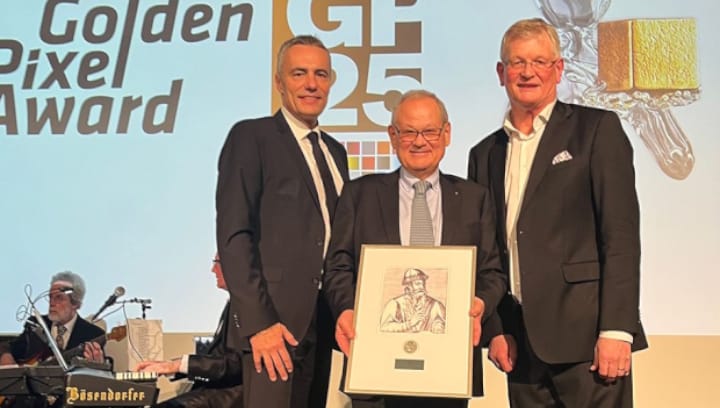 EMGROUP Der vom österreichischen VFG (Verein Forschung für die graphischen Medien) verliehene »Gutenberg Award«, mit dem verdiente Persönlichkeiten der Druckmedien-Industrie ausgezeichnet werden, ging in diesem Jahr an Ferdinand Rüesch Sr., langjähriger CEO der Gallus-Group, St. Gallen/CH.