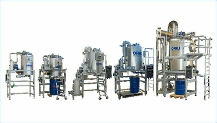 OFRU RECYCLING Verschmutzte Lösemittel (organischer oder wässriger Art) können durch Destillation und anschließender Kondensation aufbereitet werden. Hierfür bietet OFRU eine breite Palette an Destillationsanlagen an. Je nach Anforderung der Destillation werden Destilliergeräte eingesetzt, mit denen pro Stunde 2–2000 Liter mittels Destillation aufbereitet werden können. Idealerweise werden diese Destillationsanlagen mit bereits existierenden Lösemittel-Waschsystemen in einer Destillation-Waschanlagen-Kombination eingesetzt.