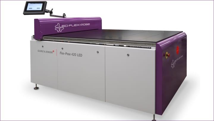 GLUNZ & JENSEN Das Flexo-Pose 420 LED-Belichtungssystem (Plattengrößen bis zu 1070 x 1530 mm [42“ x 60“]) verfügt über eine kompakte Stellfläche und ein gekühltes Bett. Dieses einseitige LED-Belichtungssystem kombiniert elegante Einfachheit mit bahnbrechender LED-Technologie. Das Ergebnis ist eine erschwingliche, einfach zu bedienende Belichtungseinheit. LEDs sorgen für eine konsistente und präzise Punktwiedergabe in kürzerer Zeit und mit geringerem Energieverbrauch als ein herkömmliches Belichtungsgerät.