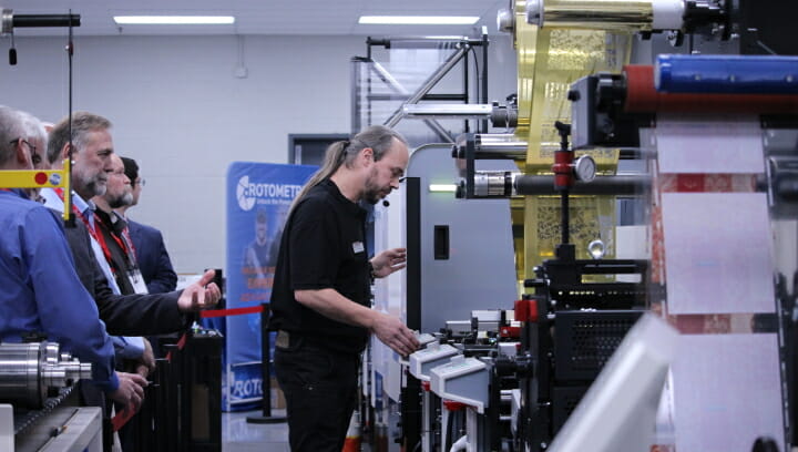 An Tag 2 der Eröffnung erläuterte Tom Staib von DWS Printing Associates, Inc. die Vorteile und Vorzüge, die er mit seiner MPS/Domino Printing EF Symjet-Hybridmaschine gemacht hat.