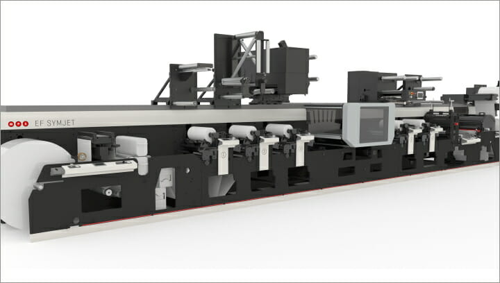 Gezeigt wird die hybride EF Symjet wird erstmals mit einer exklusiven digitalen Domino N617i-Inkjet-Einheit in der größeren Breite 430 mm /17”) und im neuen Farbschema. Die Ausstattung umfasst fünf Flexostationen, digitale Folienveredelung (kalt), Kurz-Folieneinheit (kalt) für Einzelbilder und optische Effekte, Laminieren und Stanzen. (Foto: MPS)