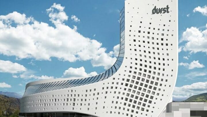 »Ein Gebäude, das in die Zukunft projiziert, aber mit einem gemeinsamen Faden, der es mit der Vergangenheit verbindet: Die Inspiration für die Turmstruktur stammt von einem 1963 nie realisierten Projekt, eine Idee, mit der die Architekten des neuen Hauptsitzes den innovativen Charakter von Durst von außen unterstreichen. Auf einer Gesamtfläche von fast 30.000 m2 befinden sich Arbeitsplätze, die Hightech mit Komfort verbinden, Bereiche zum Entspannen, ein Raum für Familien von Mitarbeitern und ein Showroom – das Customer Experience Center –, der so konzipiert wurde, dass er der Ort wird, an dem Kunden aus aller Welt die gesamte Lösungspalette von Durst kennenlernen können.« (Quelle: Converting / Durst)