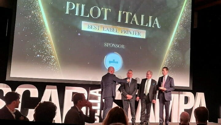 In der Kategorie »Best Label Printer« ging der Preis an Pilot Italia in Cornate d’Adda, MB/I. Giancarlo und Andrea Vimercati nehmen die Auszeichnung von Ferdinand Rüesch Sr. vom Sponsor Gallus Ferd. Rueesch AG entgegen. (Foto: stampamedia.net)