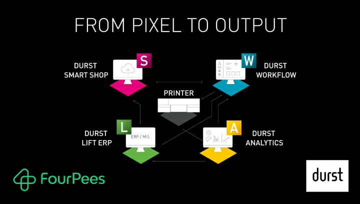 Four Pees bietet am 5. Mai 2022 ein Online-Webinar an, um über die neue Partnerschaft und den 360°-Ansatz von Durst bei der Druckautomatisierung vorzustellen. Klicken Sie hier, um sich zu registrieren! (Grafik: Durst)
