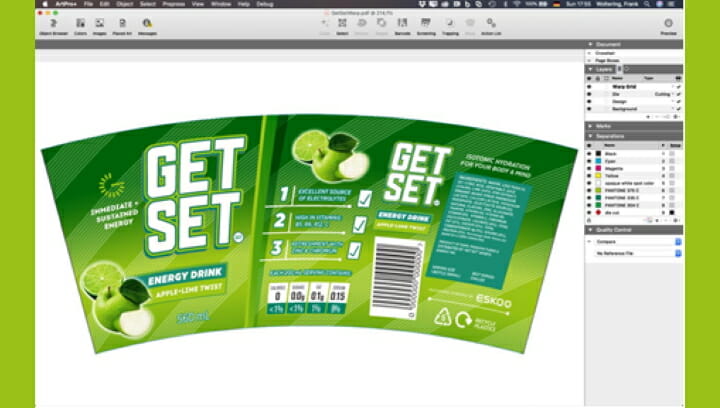 ArtPro+ 18.1 öffnet jedes native PDF, einschließlich PDF/X-4-kompatibler Dateien, und ermöglicht es dem Benutzer, daraus einen Produktionsmaster für Verpackungen zu machen, indem er verpackungsspezifische Inhalte wie Barcodes, Trapping und Screening hinzufügt. Darüber hinaus unterstützt ArtPro+ 18.1 die Verarbeitungsschritte nach ISO 19593-1 vollständig, um die Daten standardmäßig zu veredeln.