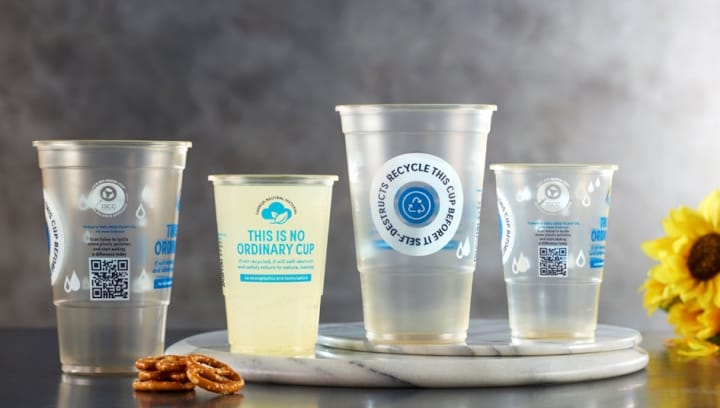 Der Becher ist recycelbar und verfügt über eine zeitverzögerte Biotransformationsfunktion, die aktiviert wird, wenn er nicht in den Recyclingstrom gelangt, und ihn innerhalb von zwei Jahren zerfallen lässt. Solange diese Funktion inaktiv ist, verhält sich das Material – ein Polymer aus recyceltem Speiseöl – genau wie herkömmlicher Kunststoff. Nach Auslösung der Umwandlung zerfällt es jedoch in ein pulverförmiges Wachs, das schnell biologisch abbaubar ist.