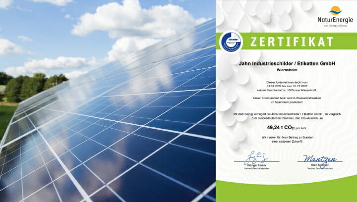 »Da wir ein sehr grünes Denken haben und bemüht sind, die Umwelt zu schützen ist es daher umso wichtiger, dass die Stromerzeugung der zugekauften Strommenge ebenso sauber ist, wie auch unsere selbst erzeugte Energie. Das haben wir nun schriftlich zertifiziert bekommen«, so das Unternehmen. (Bildquelle: Pixabay © torstensimon / Grafik: Jahn Etiketten)